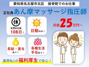 正社員(愛知県名古屋市北区)あん摩マッサージ指圧師募集!【正社員:接骨院でのお仕... 名古屋市北区 月給 250,000円 -