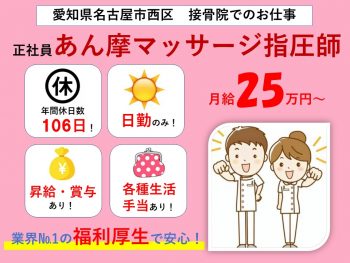 正社員(愛知県名古屋市西区)あん摩マッサージ指圧師募集!【正社員:接骨院でのお仕... 名古屋市西区 月給 250,000円 -
