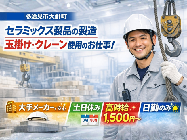 耐火物(たいかぶつ)と呼ばれる、 高温に強いセラミックス製品を製造する工場でのお仕事です! クレーン・玉掛けの資格を活かして、 製品を機械にセットしたり、 決められた位置へ移動させる作業を担当します(^^) 操作手順は決まっているので、 落ち着いて作業を進められます! 製品の加工工程では、 切断機を使った作業や、 製品に色を付ける工程にも関わることがあります♪ モノづくりの流れを実感でき、 「製品が完成していく達成感」を感じられる仕事です! 現場では先輩スタッフが近くでサポート! 作業のコツや安全面も丁寧に教えてもらえるので安心です(^_^) 世界中の製造現場を支える製品づくりに関われる、 やりがいと安定感のある仕事です! |