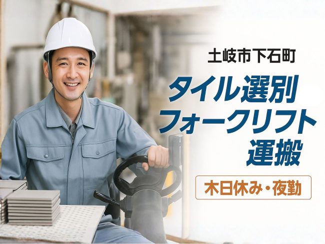 タイル製造工場での「タイル選別」と「フォークリフト運搬」のお仕事です! まずは製造されたタイルをチェックし、 割れ・欠け・色ムラなどがないかを目視で確認していきます。 難しい作業はなく、丁寧にコツコツ進めれば大丈夫です! フォークリフト(カウンターリフト)では、 完成した製品の移動や積み込みを担当します。 経験が活かせる作業なので、すぐに慣れていただけます♪ 安全第一で作業できるよう、丁寧にレクチャーするのでご安心ください!(´▽`) |